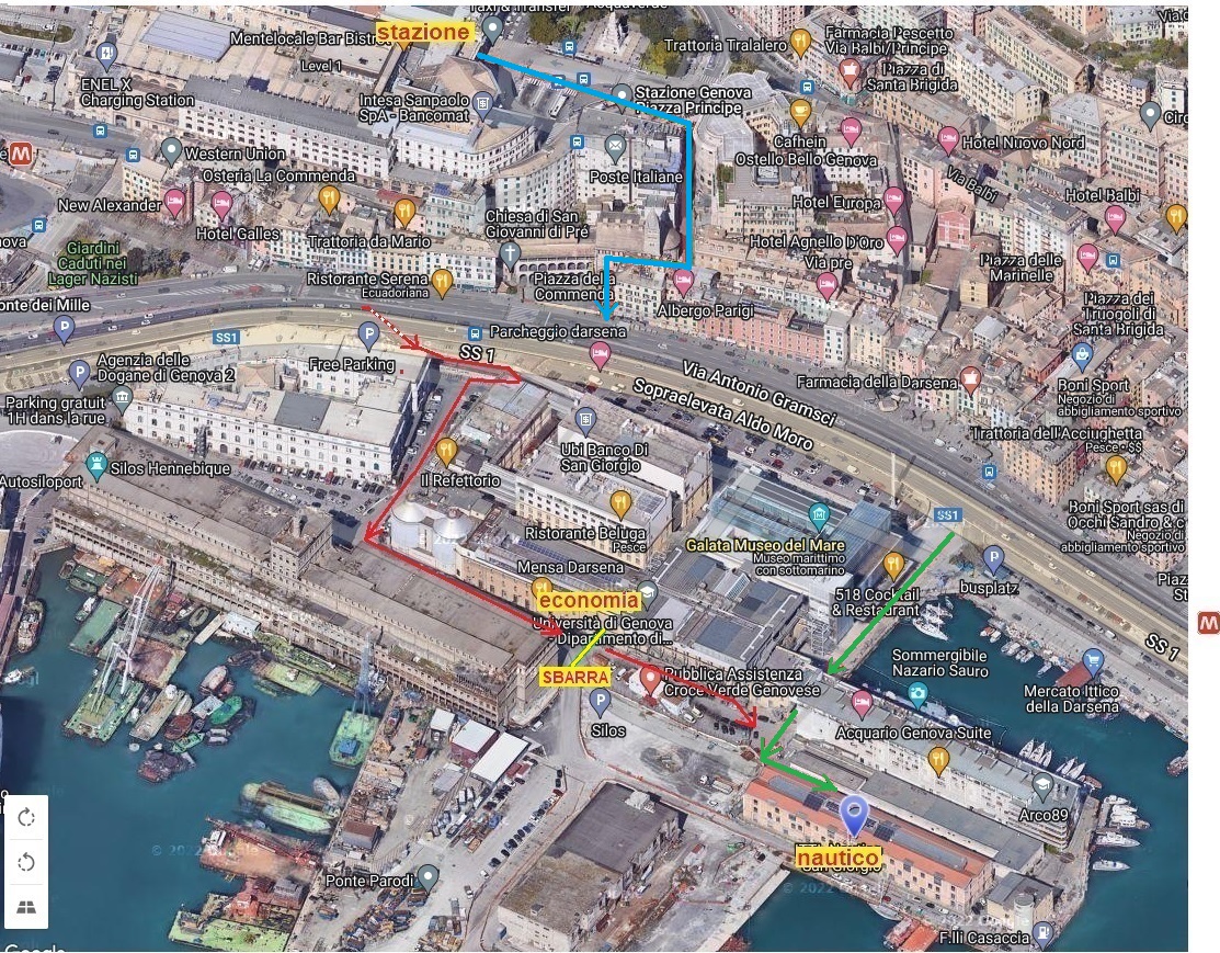 Si può accedere all'Istituto Nautico dalla strada che affianca il Galata (Museo del Mare): due minuti a piedi seguendo il percorso illustrato sotto in verde. Per chi viene col treno, al Galata si arriva a piedi dalla Stazione Principe in pochi minuti (percorso celeste). Ricordiamo, poi, che ci sono vicino fermate sia degli autobus che della metropolitana. Chi dovesse venire con l'automobile (percorso rosso) può inviare una mail per avere il codice per aprire la sbarra che consente di accedere all'area della scuola.