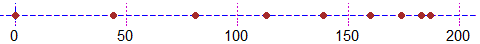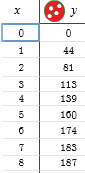 (0,0),(1,44),(2,81),(3,113),(4,139),(5,160),(6,174),(7,183),(8,187)