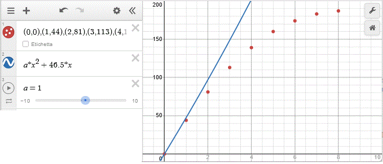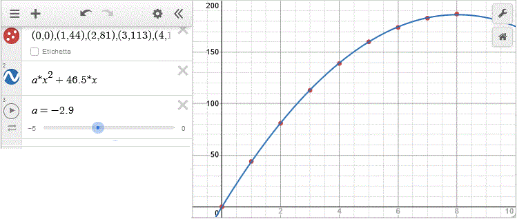 Azionando lo slider posso modificare l'andamento della curva (parabola) e vedere che essa approssima al meglio i punti tracciati quando