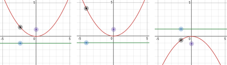 metti nel box 1 f(x) = x^2/(4*k) poi aggiungi lo slider e prova ad operare su esso metti nel box 3 y = -k metti nel box 4 (0, k) metti nel box 5 (q, f(q)) poi aggiungi lo slider e prova ad operare su esso Che cosa puoi concludere? |