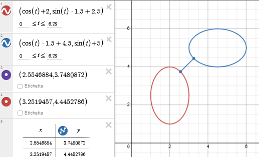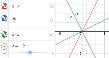 "clicca" Elaboratore grafico "metti nel box 1" y = 2*x "metti nel box 2" y = x/2 "metti nel box 3" y = k*x "clicca" k "fai scorrere il pallino sulla riga seguente" "clicca il cerchietto (||)"Poi "clicca i primi tre cerchietti per far sparire i grafici" (oppure clicca le corrispondenti X sulla destra) "metti in un nuovo box" (x+2)^2+(y-1)^2 = 4 (puoi batterlo o copiarlo da qui e incollarlo) "metti nel box successivo" (-2, 1) "che cosa ottieni?"