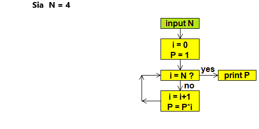 Questo diagramma di flusso rappresenta il calcolo che ad un dato numero N intero maggiore o eguale a 0 associa un altro numero P.