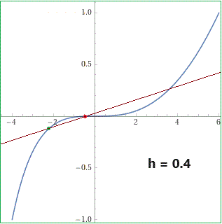 Il grafico della curva costituita dai punti: x = t*(t+5), y = t^3 per t che varia da -1 ad 1 Qual è la tangente alla curva nel punto P = (-9/4,-1/8), colorato a fianco in verde, che corrisponde a t = -1/2? A fianco la retta che passa per P e per un punto Q sulla curva (colorato in rosso) che man mano si avvicina e tende a coincidere con P. Più precisamente Q è il punto che corrisponde a t = -1/2+h per h che vale 0.4, 0.3, 0.2, 0.1. Vedi QUI se vuoi vedere come si calcola la pendenza della tangente. |