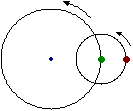 Un corpo descrive una traiettoria circolare, con velocità di rotazione costante. Un secondo corpo ruota attorno al primo con velocità di rotazione doppia e orbita di raggio dimezzato. Ad un certo istante i due corpi sono nella posizione raffigurata a lato. Qual è la traiettoria del secondo corpo? |