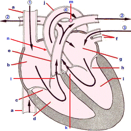 1 dal corpo a una delle due vene cave (nell'atrio destro entra anche la vena coronaria, che porta il sangue proveniente dal cuore stesso) b atrio destro c valvola tricuspide d ventricolo destro e arteria polmonare 9 cuore 2 ai polmoni 3 dai polmoni f vene polmonari g atrio sinistro h valvola mitrale i ventricolo sinistro j aorta (da cui si staccano le due arterie coronariche che provvedono alla irrorazione sanguigna del cuore) k,l valvole aortica e polmonare m dotto di Botallo (tra a. polmonare e aorta, normalmente si chiude alla nascita) n foro di Botallo, qui nascosto dall'aorta (tra atrio destro e sinistro, normalmente si chiude alla nascita) 4 al corpo Vedi anche qui (arterie del cuore), qui (battiti/elettrocardiogramma), qui (circolazione del sangue) e qui (pressione) |