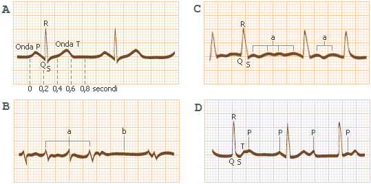 delle onde non viene rispettata. B: in particolare, nella tachicardia vi è un aumento del numero delle pulsazioni, che diventano più rapide e deboli (tratto a) e quindi si arrestano (tratto b). C: nell'aritmia da fibrillazione, le onde QRS non sono equidistanti, come avviene in condizioni normali, e le onde P sono sostituite dal tratto a, che esprime la fibrillazione degli atri (contrazione non coordinata delle fibre muscolari cardiache). D: nel blocco atrio-ventricolare si osserva una distribuzione irregolare di onde QRS e di onde P. La frequenza cardiaca normale di un adulto a riposo vada 55 a 90 battiti al minuto. Nei bambini va da 75 a 110 battiti al minuto. Nei neonati va da 90 a 180 battiti al minuto. La tachicardia pu essere dovuta ad eventi fisiologici o funzionali come la gravidanza, imbarazzi gastrici, consumo eccessivo di caffè, sforzi fisici, stati febbrili, o a cause cardiache (arteriosclerosi, insufficienza coronarica, ), a periodi di eccitazione ed emotivit , |