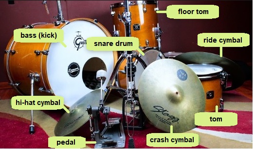hit-hat (charleston - coppia di piatti), grancassa, pedale della grancassa, rullante, piatto crash, timpano, tom-tom, piatto ride