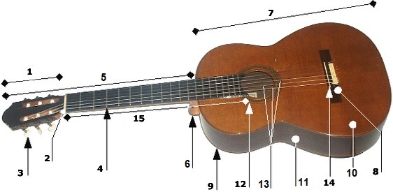 1 Headstock / paletta 2 Nut / capotasto 3 Machine heads (or pegheads, tuning keys, tuning machines, tuners) / accordatore 4 Frets / sbarrette trasversali 5 Neck / manico 6 Heel / scudetto 7 Body / corpo 8 Bridge /ponticello 9 Back /fondo 10 Soundboard (top) / tavola armonica (parte superiore) 11 Body sides (ribs) / fasce 12 Sound hole with Rosette inlay /buca con rosetta intarsiata 13 Strings / corde 14 Saddle / ossicino 15 Fretboard (or Fingerboard) / tastiera
