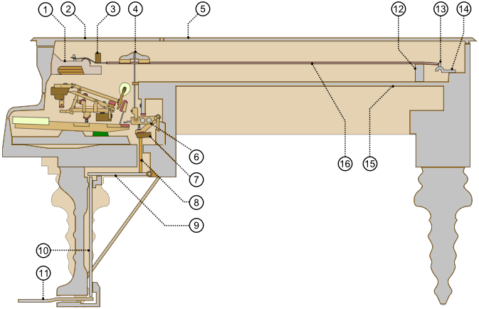 1 frame 2 coperchio, parte anteriore (lid, front part) 3 capo sbarra (capo bar) 4 damper 5 coperchio, parte posteriore (lid, back part) 6 meccanismo serranda (damper mechanism) 7 binario sostenuto (sostenuto rail) 8-10 meccanismo del pedale , aste (pedal mechanism, rods) 11 pedali: a destra [sustain/risonanza], mezzo [sostenuto], a sinistra [soft/una corda ] (pedals: right [sustain/damper], middle [sostenuto], left [soft/una-corda]) 12 ponte (bridge) 13 perno intoppo (hitch pin) 14 telaio (frame) 15 tavola armonica (sound board) 16 corda (string)