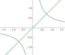 | È il grafico di x → 1/(2·x) plot y-1/(2*x) = 0 → intersect y = 1/(2*x), y = x x = -1/sqrt(2), y = -1/sqrt(2) x = 1/sqrt(2), y = 1/sqrt(2) | ![]() |