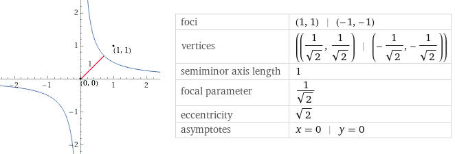 hyperbola center (0, 0), focus (1, 1), semimajor axis length = 1