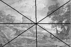 | In altri dipinti, risalendo ai disegni di prova originali, si intravvedono i segni dell'organizzazione spaziale, come in questo paesaggio di Claude Lorrain. | ![]() |