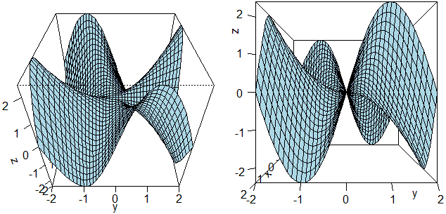 persp(x,y,z, theta=90, phi=40, col="lightblue",ticktype="detailed")