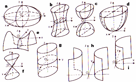 (a) ellissoide (x2/a2+y2/b2+z2/c2 = 1), (b) iperboloide a una falda (x2/a2+y2/b2-z2/c2 = 1), (c) iperbolide a due falde (x2/a2-y2/b2-z2/c2 = 1), (d) parabolide ellittico (x2/a2+y2/b2 = 2pz), (e) paraboloide iperbolico (x2/a2-y2/b2 = 2pz), (f) doppio cono (x2+y2=z2r2), (g) cilindro ellittico, (h) cilindro iperbolico, (i) cilindro parabolico |
