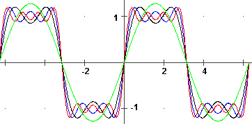 (sin(x)+sin(3x)/3+ ... +sin((2N+1)x)/(2N+1))*(4/π), per diversi valori di N. (vedi qui o qui)