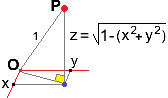 Un punto P = (x,y,z) della sfera (vedi la figura sotto a sinistra, che riprende la figura precedente) dista 1 da O, quindi abbiamo, per il teorema di Pitagora: