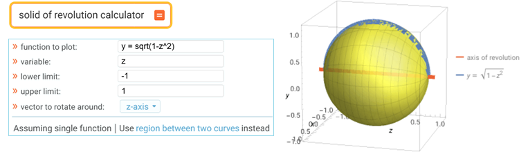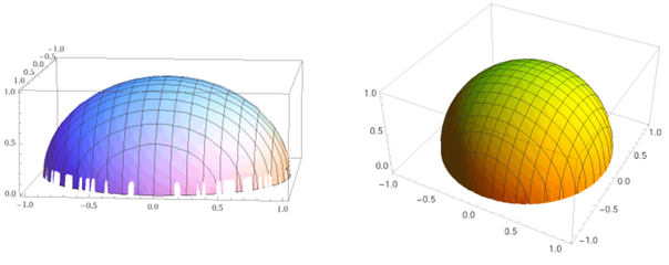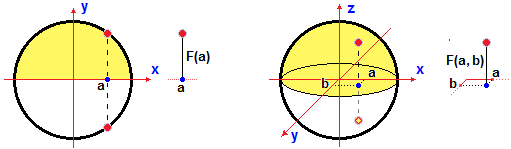 Analogamente una sfera non può essere pensata come il grafico di una funzione di due variabili, mentre possono esserlo o la semisfera che sta al di sopra del piano orizzontale che la taglia in due parti uguali o quella che sta al di sotto di essa. Cerchiamo di descrivere analiticamente la funzione F che ha come grafico la metà superiore della sfera di raggio 1 centrata in (0, 0, 0). Vedi la figura sopra a destra.