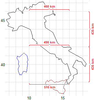 Rappresento la superficie terrestre sul piano, mantenendo i paralleli tra loro "paralleli" e raffigurando con rette parallele, verticali, anche i meridiani (che invece avvicindosi ai poli convergono) come nel disegno sotto a destra. Il 42º parallelo in questa rappresentazione è raffigurato con la stessa scala dei meridiani, ma i paralleli superiori sono allungati e quelli immediatamente inferiori sono accorciati. In questa cartina solo nei pressi del 42º parallelo vale con una buona approssimazione il teorema di Pitagora. Ma "esattamente" esso non vale in alcuna porzione della cartina.