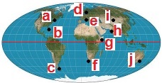 | La località in cui le temperature medie nei due mesi sono eguali è quella più vicina all'equatore, g (Mogadiscio). Nell'emisfero settentrionale le stagioni calde/fredde sono le stesse dell'Italia, in quello meridionale sono invertite (quando da noi è estate là è inverrno). La meno calda in estate nel nostro emisfero è d (Stoccoloma). i (Wusu) è al centro di una zona desertica, quindi, pur essendo alla stessa altezza di Roma (e) ha un forte salto di temperatura. Roma è più temeparata di New York (a), in quanto è circondata dal Mar Mediterraneo. h è più vicina all'equatore, quindi ha una temperatura invernale più vicina a quella estiva. La città più fredda a luglio è quella più a sud, c, Santa Cruz. Città del Capo (f) e Sydney (j) hanno temperature simili. |