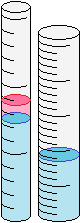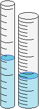 Quindi il liquido in questo secondo cilindro, nonostante raggiunga un'altezza inferiore, è di più. A sinistra è evidenziata la posizione che il liquido nel cilindro a destra raggiungerebbe nel cilindro a sinistra. | |