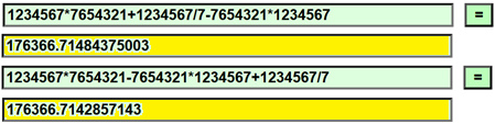 1234567*7654321 + 1234567/7 - 7654321*1234567 e di 1234567*7654321 - 7654321*1234567 + 1234567/7
