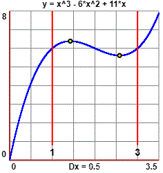 Dobbiamo studiare l'andamento di questa funzione. d(A3 - 6 A2 + 11 A) / dA = 3A2 - 12A + 11. È una quadratica con coefficiente direttivo positivo. La nostra funzione ha quindi pendenza negativa tra le due eventuali soluzioni di 3A2-12A+11 = 0; cerchiamole. 12/6 - √(122-3·4·11)/6 = 2 - 2√(62-3·11)/6 = 2 - √3/3 = 2 - 1/√3, 2 + 1/√3 B assume valore massimo in 2 - 1/√3 e valore minimo in 2 + 1/√3. Con un mezzo di calcolo ne determino i valori: 5.6151 6.3849 Concludo che per A in [1,3] B sta in [5.615 , 6.384 ] che è contenuto in [5.6, 6.4]. Posso dire che per A = 2 ± 1 B = 6.0 ± 0.4. | ![]() |