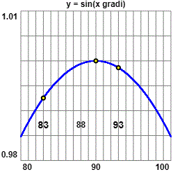 Posso concludere (vedi figura seguente) che sin(88°±5°) sta in [0. 99254615 , 1], ovvero in [0. 9925, 1], non in [0. 99254615 , 0. 99862953 ].