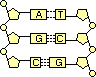 | Il DNA è una molecola costituita da due catene (o filamenti) di nucleotidi, ciascuno costituito da un gruppo fosfato (a lato raffigurato con un cerchietto) e da uno zucchero desossiribosio (raffigurato con un pentagono), componenti che sono uguali in tutti i nucleotidi, e da una base azotata, scelta tra adenina (A), guanina (G), timina (T) e citosina (C). Ogni nucleotide di una catena è legato a uno dell'altra mediante legami ad idrogeno tra le corrispettive basi azotate (i legami sono tra A e T o tra C e G). Clicca l'immagine se vuoi ingrandirla. |