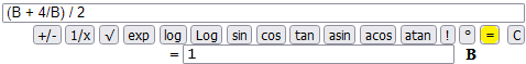 (2.000000000000002 + 4/2.000000000000002) / 2 = 2 (2.0000000929222947 + 4/2.0000000929222947) / 2 = 2.000000000000002 (2.000609756097561 + 4/2.000609756097561) / 2 = 2.0000000929222947 (2.05 + 4/2.05) / 2 = 2.000609756097561 (2.5 + 4/2.5) / 2 = 2.05 (1 + 4/1) / 2 = 2.5 (B + 4/B) / 2