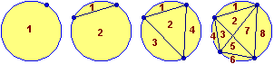 | In quante parti posso suddividere un cerchio se traccio su di esso N punti e li congiungo in tutti i modi possibili con dei segmenti? Nella figura seguente sono illustrati i casi N=1, N=2, N=3 e N=4. |