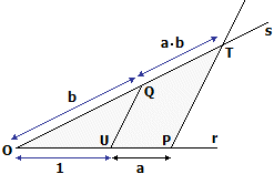 se a e b sono le misure di due segmenti S1 e S2 rispetto all'unità di misura OU, a·b è la misura del segmento QT costruito nel modo seguente: preso P su r tale che UP sia uguale a S1, presa comunque s passante per O e diversa da r, preso Q su s tale che OQ sia uguale a S2, tracciata la parallela a UQ passante per P, T è il punto in cui questa interseca s. La giustificazione di questa scelta si appoggia sul teorema delle proiezioni parallele (o di Talete): QT / OQ = UP / OU. | ![]() |