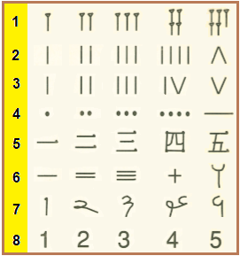Qui a fianco è rappresentato il modo in cui i primi cinque numeri interi positivi venivano (o sono) indicati nella notazione