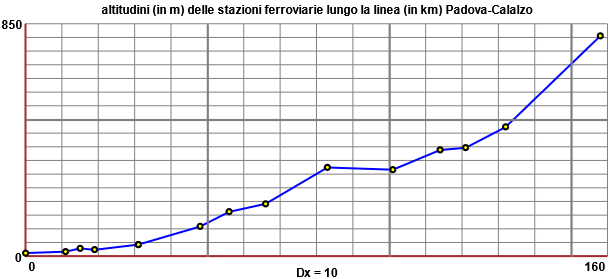 ... aX = 0; bX = 160; aY = 0; bY = 850 Dx = 10; Dy = 50 titolo = "altitudini (in m) delle stazioni ferroviarie lungo la linea (in km) Padova-Calalzo" Cax="brown"; Cgr="grey" quadro=1 C0="blue"; C1=C2=C3=C4="grey" Q0x=L0x = [ 0,11,15,19,31,31, 48, 56, 66, 83,101,114,121,132,158] Q0y=L0y = [12,17,29,24,43,43,109,163,192,325,317,389,397,473,806] L1x=[50,50]; L1y=[0,850]; L2x=[100,100]; L2y=[0,850]; L3x=[150,150]; L3y=[0,850] L4x=[0,160]; L4y=[500,500] ...