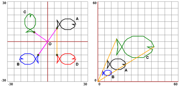 Se intendiamo che due "figure piane sono uguali" quando esiste un movimento piano che trasforma l'una nell'altra, possiamo dire che le figure (1) e (2) del quesito sono uguali. Analogamente la figura F e la figura A della illustrazione seguente sono uguali, così come lo sono il pesce giallo della seconda figura e gli altri due pesci bianchi ottenuti con rotazioni di 90° e 180°. Essi non sono invece uguali al pesce rosa della stessa illustrazione: non sono sovrapponibili ad esso con un movimento piano (occorre un ribaltamento). In genere è questo il modo in cui è usato l'aggettivo "uguale" quando si confrontano figure del piano.