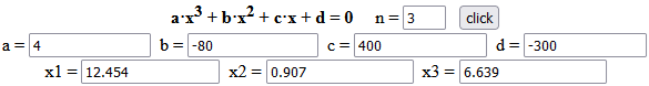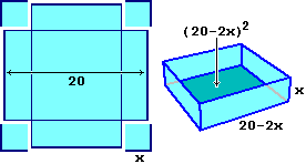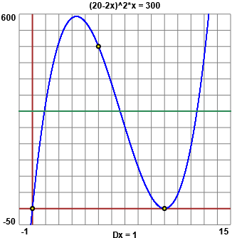 ![]() | • Devo realizzare una scatola del volume di 300 cm³ tagliando da una lamiera quadrata di lato 20 cm quattro quadratini di lato x cm e operando successive piegature e saldature. Come devo effettuare i tagli? Devo trovare le soluzioni tra 0 e 10 di Schizzando i grafici (sopra realizzati con questo script) capisco che ci sono due soluzioni, una vicina ad 1 (cm), l'altra vicina a 7. Facendo il grafico col computer in scale diverse posso trovare con la precisione che voglio le soluzione. Se conosco tecniche per risolvere algebricamente le equazioni polinomiali di 3º grado posso trovare le soluzioni esatte; altrimenti posso ricorrere a questo script o ad un programmino in JavaScript (vedi) o a WolframAlpha. |