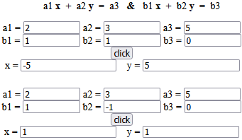Possiamo quindi trovare le soluzioni determinando i punti di intersezione di 2x+3y=5 con y=x e con y=x, che si trova facilmente essere (-5,5) e (1,1). In casi più complicati per trovare le intersezioni si può utilizzare il computer per controllare le soluzioni. Ecco ad esempio (a lato) l'impiego dello script "sistemi equazioni" presente qui: |