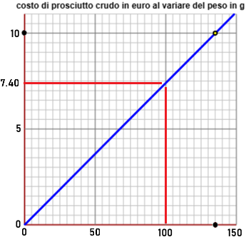 Quanto costava all'etto il prosciutto? Trova la risposta sia utilizzando il grafico qui a fianco sia facendo opportuni calcoli. Procedimento grafico: ![]() |