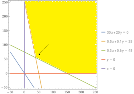 minimize[30x+20y, {0.5x+0.1y>=25 && 0.3x+0.6y >= 45 && y>=0 && 0<=x} ]
