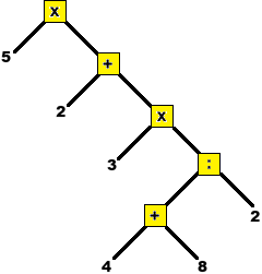 5·(2+3·(4+8):2) = 5·(2+3·12:2) = 5·(2+3·6) = 5·(2+18) = 5·20 = 100