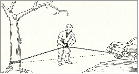 Devo smuovere un'automobile che è rimasta bloccata nel fango. È necessaria una grande forza per tirarla fuori. Lego con una fune resistente l'automobile ad un albero vicino. Poi tiro in su la fune. |