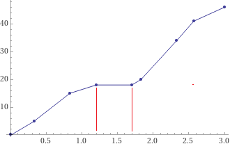 plot {(0,0),(0.33,5),(0.83,15),(1.2,18),(1.7,18),(1.83,20),(2.33,34),(2.57,41),(3,46)}