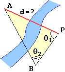 raffigurati a fianco. Se troviamo che BP = 0.51 km, θ1 = 76°, θ2 = 54°, usando opportunamente un goniometro, un foglio di carta ed una riga graduata, determina d. |