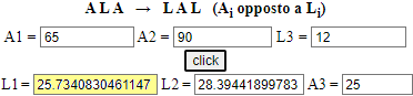 | α = 65°, d = 12 m Sul grafico a lato "leggo" 26 m (valore arrotondato a due cifre; arrotondati erano, ovviamente, anche i dati di partenza). Per altri commenti: proporzionalità neGli Oggetti Matematici.Successivamente, si possono fare i calcoli facilmente con lo script "tri ang-lato-ang" ottenendo: ![]() L'insegnante può controllare i calcoli anche con la "calcolatrice" accessibile da qui: 65 [°] 1.1344640137963142 (B) B [tan] 2.1445069205095586 (B) B*12 25.734083046114705 che arrotondo a 26. | |