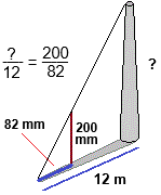 | Un obelisco proietta sul terreno, pianeggiante, un'ombra lunga 12.0 m. Un'asta lunga 20.0 cemtimetri appoggiata verticalmente sul terreno proitetta un'ombra lunga 82 millimetri. Quanto è alto l'obelisco? (il disegno a fianco illustra la situazione, ma rappresenta l'asta più lunga di quanto è in realtà) | ![]() |
