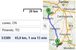 da un'altra località si ottiene quanto riprodotto a lato. Quale sarebbe la velocità media di un'auto che percorresse questo tratto di strada nel modo indicato? (tieni conto che i valori indicati sono arrotondati) |