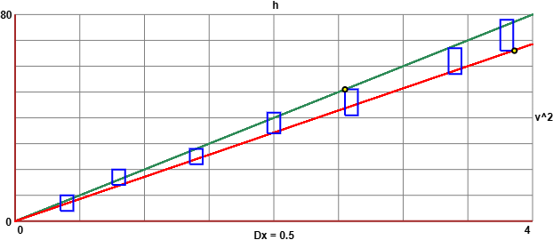 Una pietra viene lanciata verso l'alto con velocità v e raggiunge l'altezza h, e si rilevano opportunamente h (in m) e v2 (in m2/s2) ottenendo i seguenti intervalli di indeterminazione: