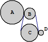 | Considera l'ingranaggio raffigurato a lato. Sotto sono indicate tre funzioni che esprimono la velocità di rotazione (in giri/min) di B, di C e di D in funzione della velocità di rotazione di A. Associa a ogni funzione la ruota finale (B, C o D) corrispondente e tracciane, sul medesimo sistema di riferimento, il grafico. Le ruote A, B, C e D hanno diametro di, rispettivamente, 20, 10, 15 e 5 cm. | ![]() |