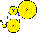 | Considera l'ingranaggio raffigurato a lato. Sotto sono indicate tre funzioni che esprimono la velocità di rotazione (in giri/min) di Y, di Z e di W in funzione della velocità di rotazione di X. Associa a ogni funzione la ruota finale (Y, Z o W) corrispondente e tracciane, sul medesimo sistema di riferimento, il grafico. Le ruote W, Z, Y e X hanno diametro di, rispettivamente, 10, 30, 20, e 40 cm. | ![]() |