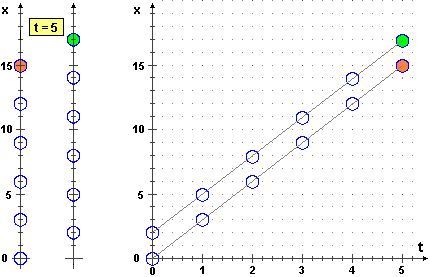 | A lato sono rappresentati, in ordine: il movimento del punto la cui posizione in funzione del tempo è descritta da x=3t (viaggia a 3 m/s), quello del punto la cui posizione in funzione del tempo è descritta da x=2+3t (che si mantiene 2 m davanti al punto precedente), i grafici della relazione tra t e x per entrambi i movimenti. | ![]() |