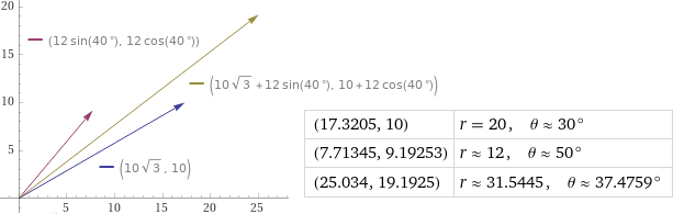 vector(cos(30°)*20,sin(30°)*20), vector(cos(50°)*12,sin(50°)*12), vector(cos(30°)*20+cos(50°)*12,sin(30°)*20+sin(50°)*12)
